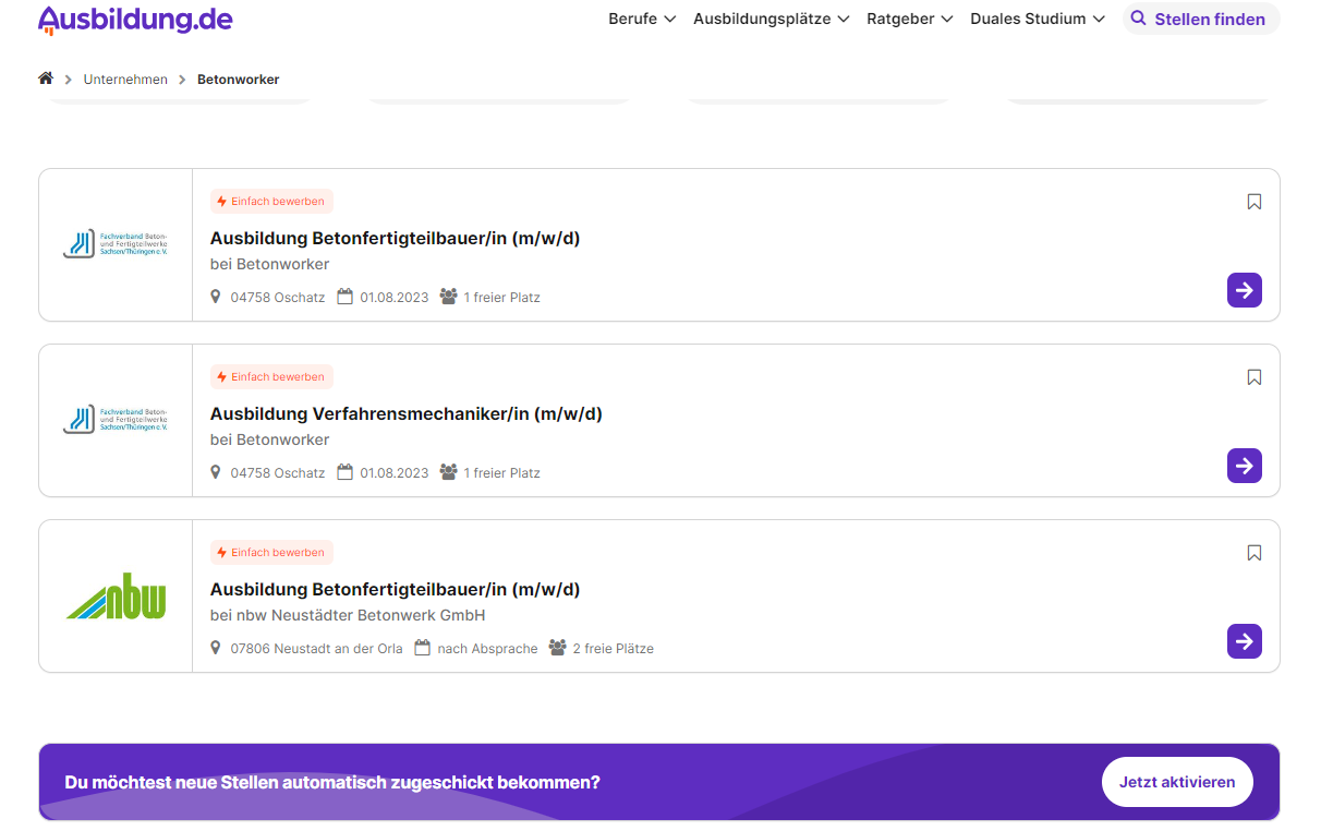 Unter dem Namen „Betonworker“ bietet der Fachverband Beton- und Fertigteilwerke Sachsen/Thüringen seinen Mitgliedern die Möglichkeit, über ein sogenanntes Partnerprofil auf Ausbildung.de, vakante Ausbildungsstellen kostenfrei einzustellen.